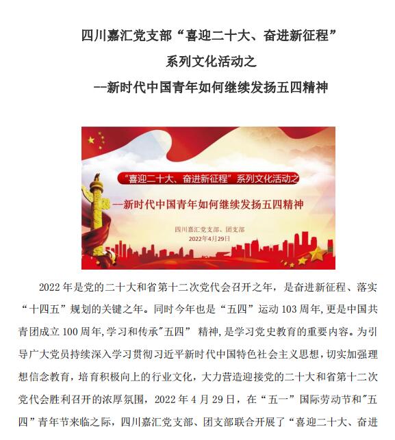 四川嘉匯黨支部“喜迎二十大、奮進新征程” 系列文化活動之 --新時代中國青年如何繼續(xù)發(fā)揚五四精神