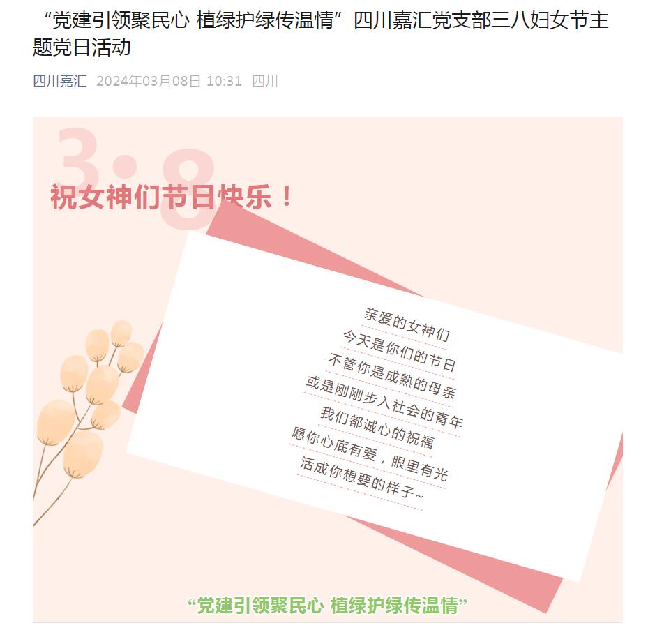 “黨建引領(lǐng)聚民心植綠護(hù)綠傳溫情”四川嘉匯黨支部三八婦女節(jié)主題黨日活動(dòng)