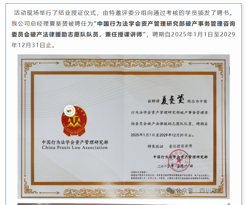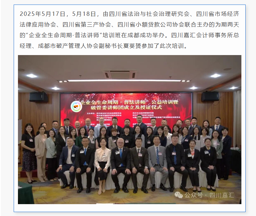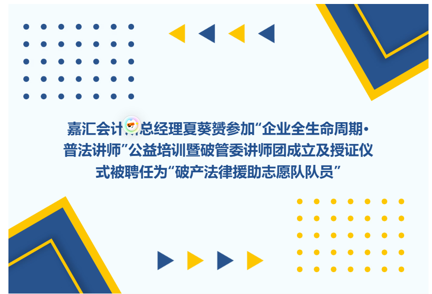 嘉匯會計所總經(jīng)理夏葵赟參加“企業(yè)全生命周期·普法講師”公益培訓(xùn),被聘任為“破產(chǎn)法律援助志愿隊隊員”